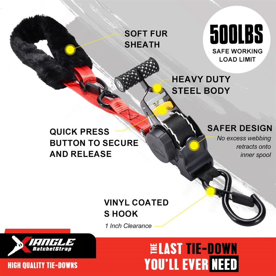Whether securing off-road motorcycles, ATVs, UTVs, or routine cargo strapping on trucks and vans, the automatic retractable design makes binding and unloading exceptionally easy.