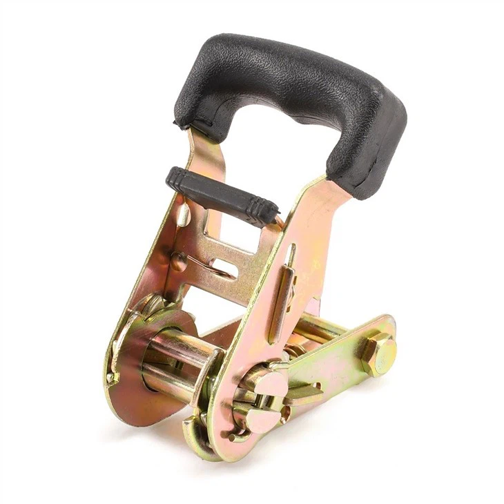 The ratchet buckle is made from durable steel and zinc-plated for maximum resistance to rust and corrosion, ensuring long-lasting performance. The rubber handle provides a comfortable grip and helps prevent slippage during use, making it easy to tighten and release the strap.